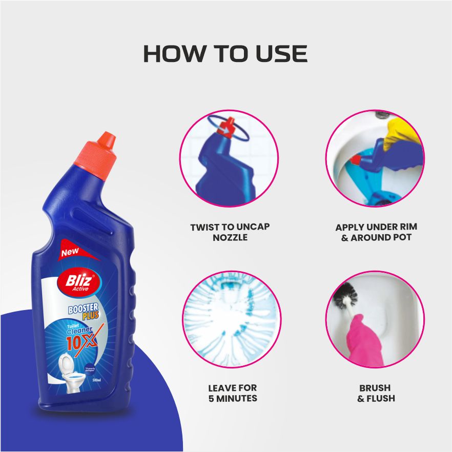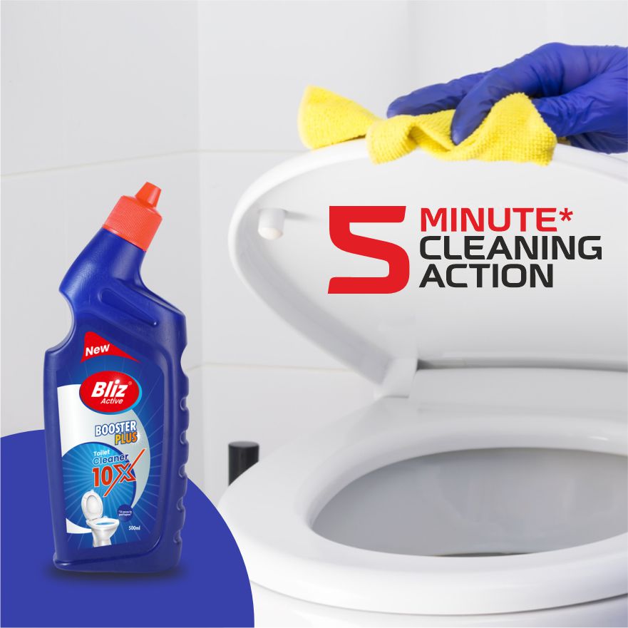 Bliz Active Booster Plus Toilet Cleaner 10X (500 ml) is a powerful formula designed to deep-clean and disinfect toilet bowls effectively. Its 10X cleaning strength removes tough stains, limescale, and germs, ensuring a hygienic and sparkling toilet every time. The ergonomic bottle with a angled nozzle allows easy application under the rim for thorough cleaning in hard-to-reach areas. Ideal for maintaining fresh, bacteria-free toilets with minimal effort, Bliz Active Booster Plus offers a reliable solution for superior bathroom hygiene.