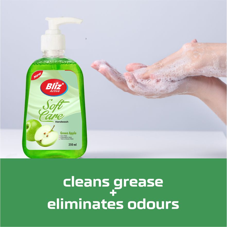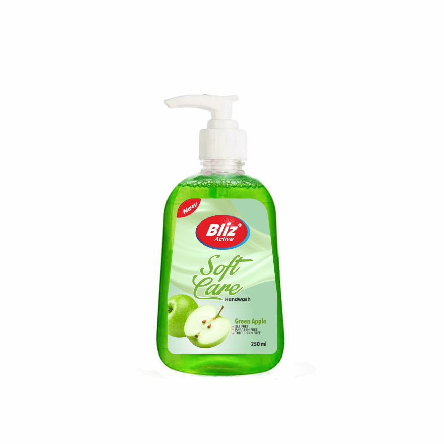 Bliz Active Soft Care Handwash Green Apple (250 ml) offers gentle cleansing and lasting freshness with a delightful green apple fragrance. Enriched with a skin-friendly formula, this handwash effectively removes dirt and germs while keeping hands soft and moisturized. It is free from sulfates, parabens, and triclosan, making it safe for everyday use by all family members. The convenient pump bottle ensures easy and hygienic dispensing with each wash, providing a refreshing experience every time.