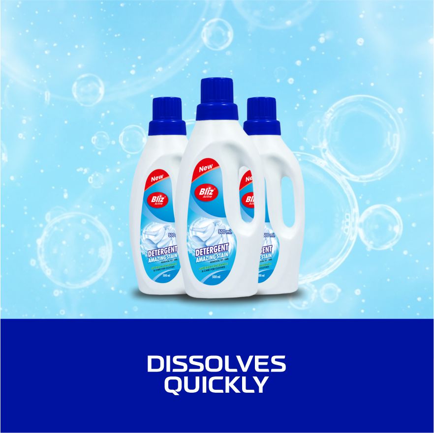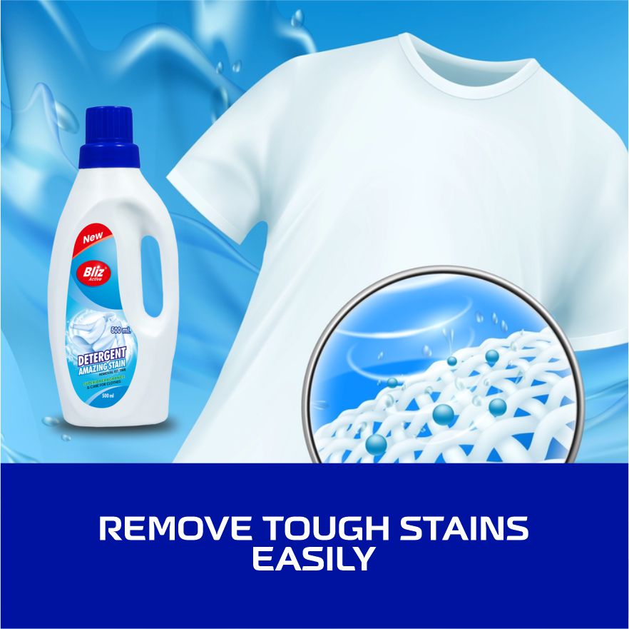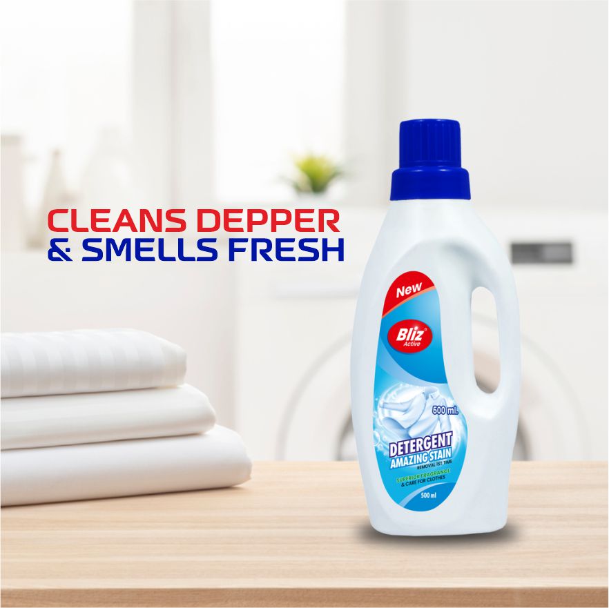 Bliz Active Detergent Amazing Stain (500 ml) is a powerful liquid detergent designed to deliver superior stain removal and gentle care for your clothes. With its advanced formula, this detergent tackles tough stains in less time while ensuring your garments retain a fresh fragrance and softness. Suitable for both hand and machine wash, Bliz Active offers outstanding cleaning performance, making laundry effortless and effective. The ergonomic bottle design provides easy handling and precise pouring for everyday use. Ideal for households seeking reliable, high-quality cleaning and lasting freshness for their clothes.